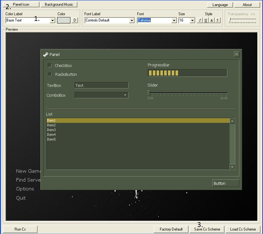 V tomto programe sa bude editovat farebná schéma GUI. Po spustení nám vyskočí rovnaké okno, ako keď sme prvý raz spustili CS Background theme maker. Tento program nám ponúka možnosť si upraviť celé menu v CS 1.6 (od schémy, keď hru spustíme až po úpravu tabuľky na skóre)